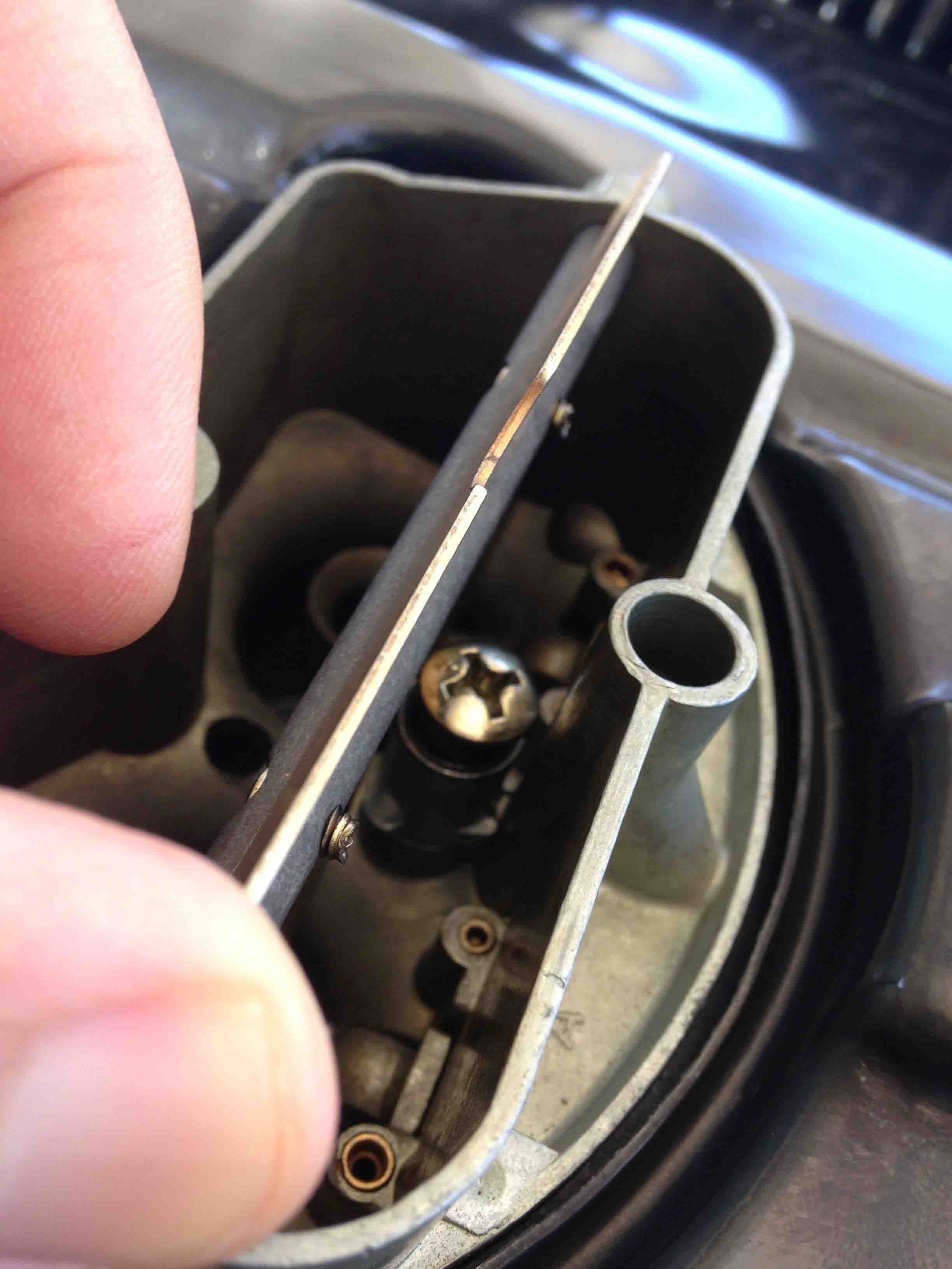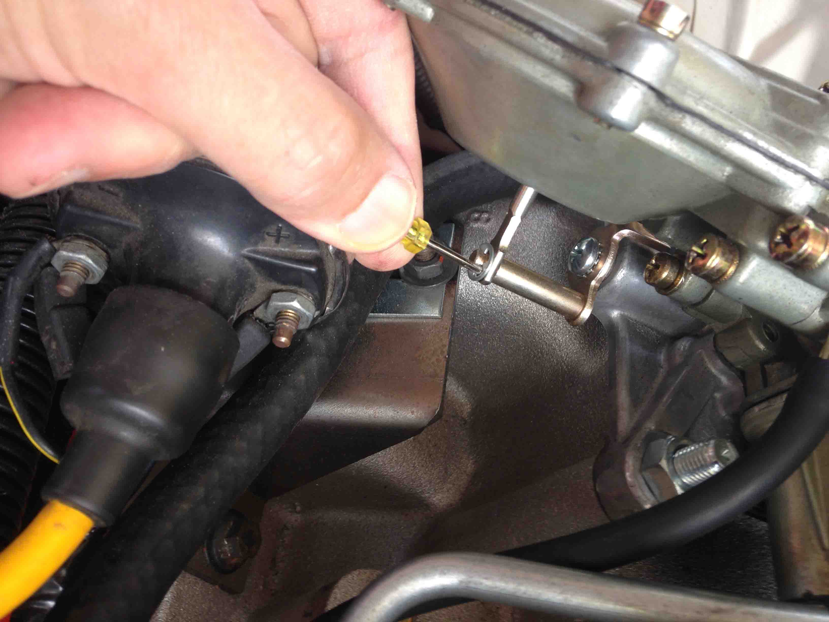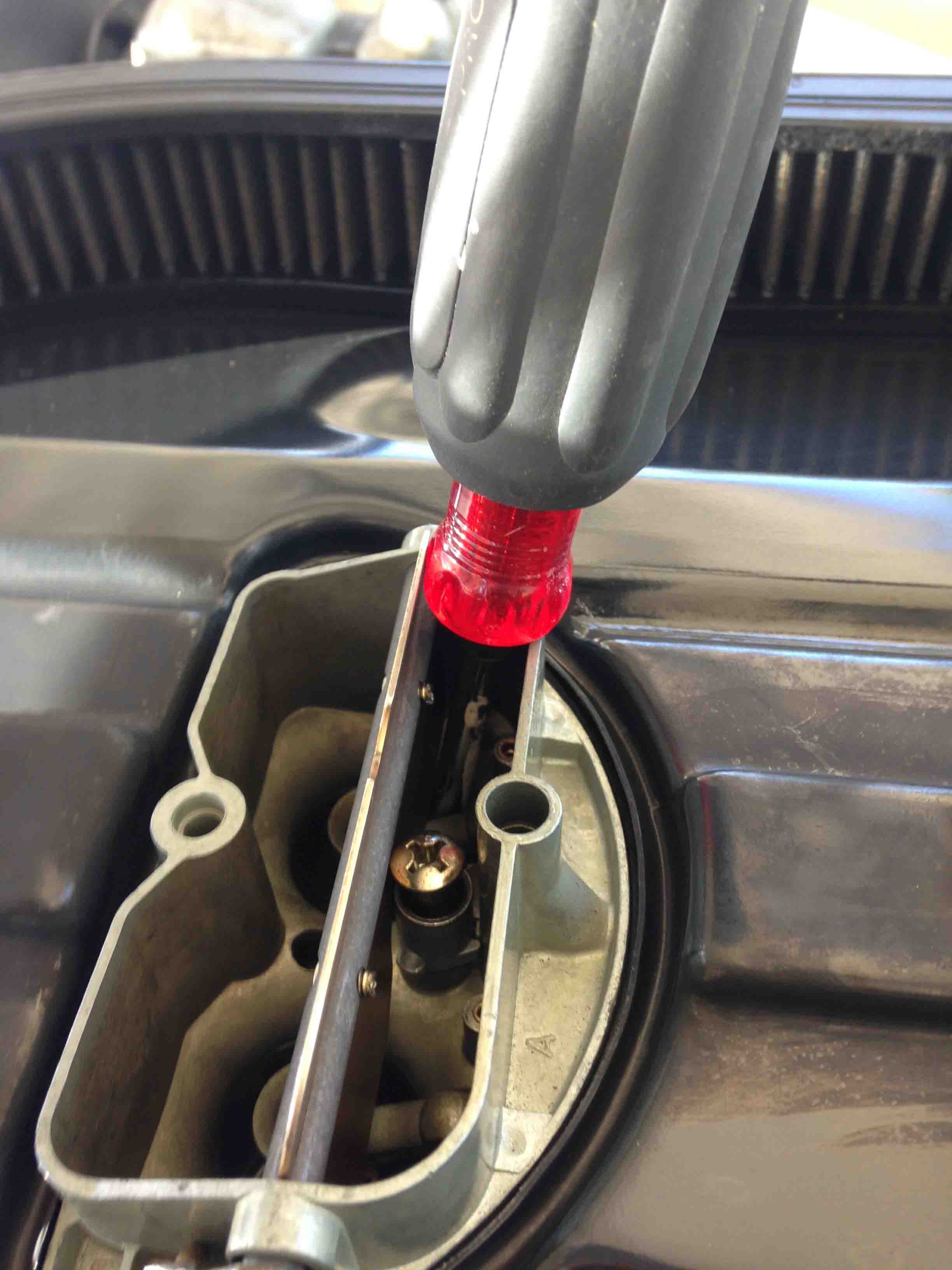 I’m taking this picture with my free hand so it’s not in focus. This action you need to be rid of all distractions, you do not want to drop this sucker into your carb throat. You need to guide this into the open hole like your life (in the near term) depends on it!