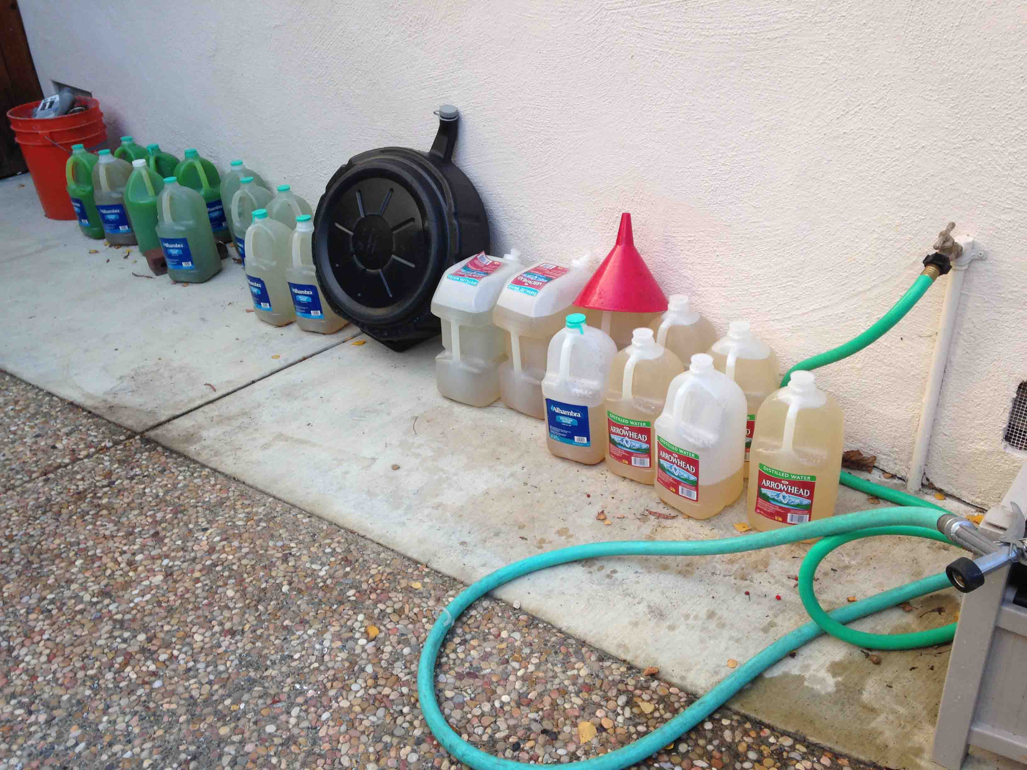 Here's my running collection of drained coolant. Notice the progression from top to bottom from the traditional 50/50 coolant water mix to virtually pure distilled water.