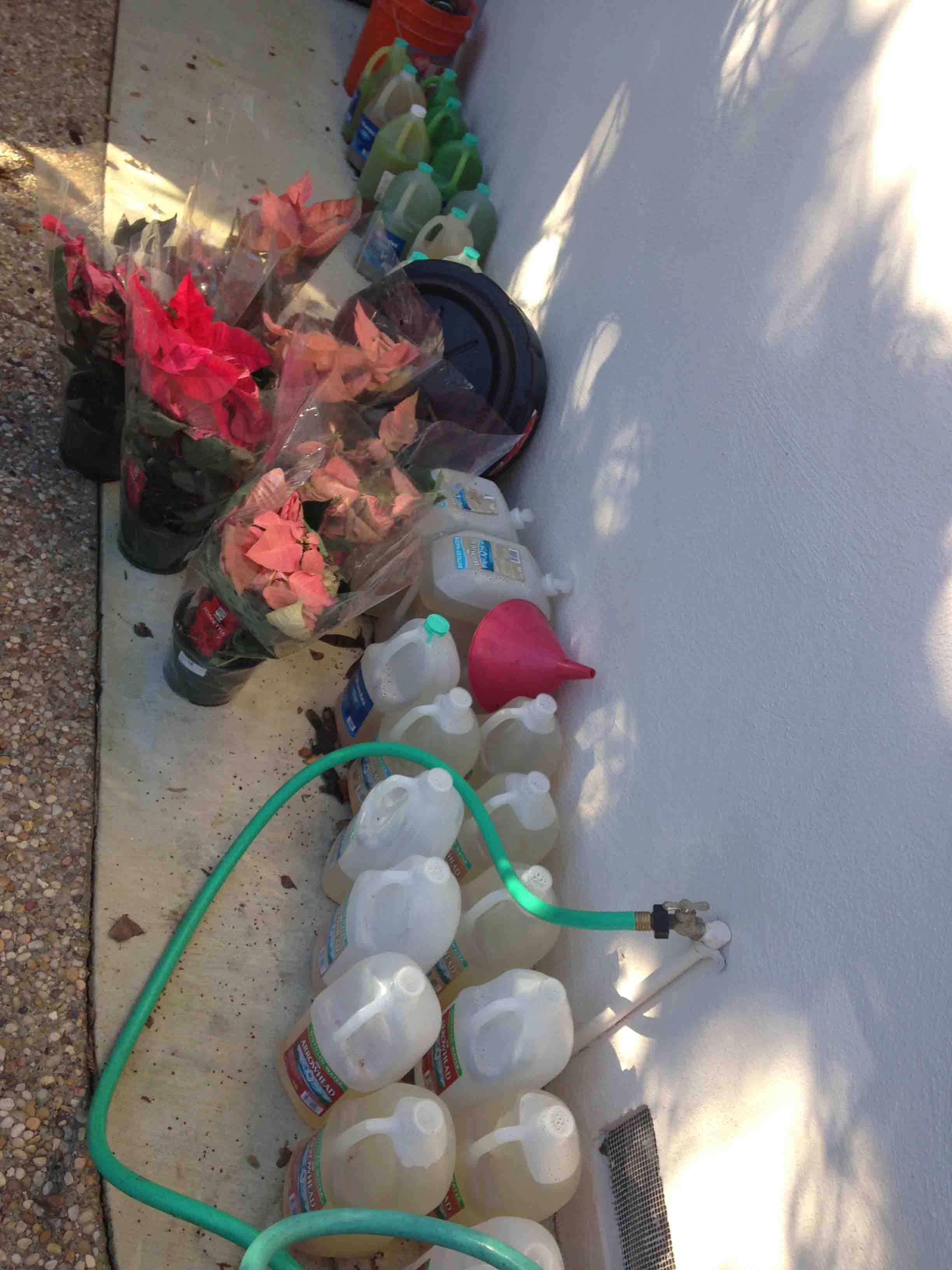 Here’s my running collection of drained coolant. Notice the progression from top to bottom from the traditional 50/50 coolant water mix to virtually pure distilled water. About 2.5 gallons every drain. You do the math. Yes, I’ve called it quits when it comes to draining. Before I put the thermostat back in I managed to get a non-coolant scent in the drain, but after I put the thermostat back in, I get at least a small scent from the drained coolant. Poinsettias not included.