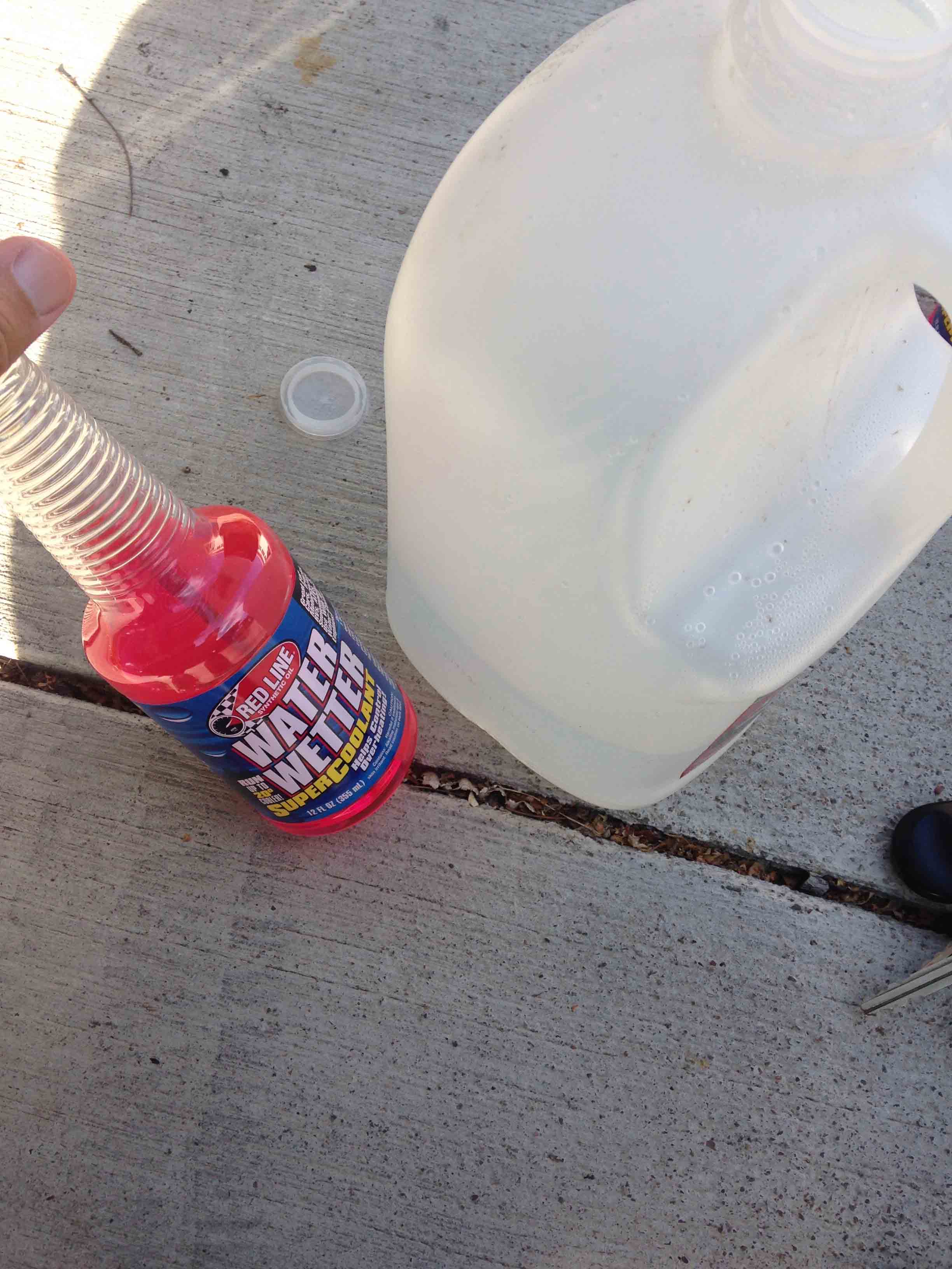 Adding a bottle of WaterWetter to my distilled water-filled cooling system. It’s good to mix it up with some distilled water in a jug before adding it to your radiator. You should drive the car immediately to normal operating temperature to ensure thorough mixing in your system.