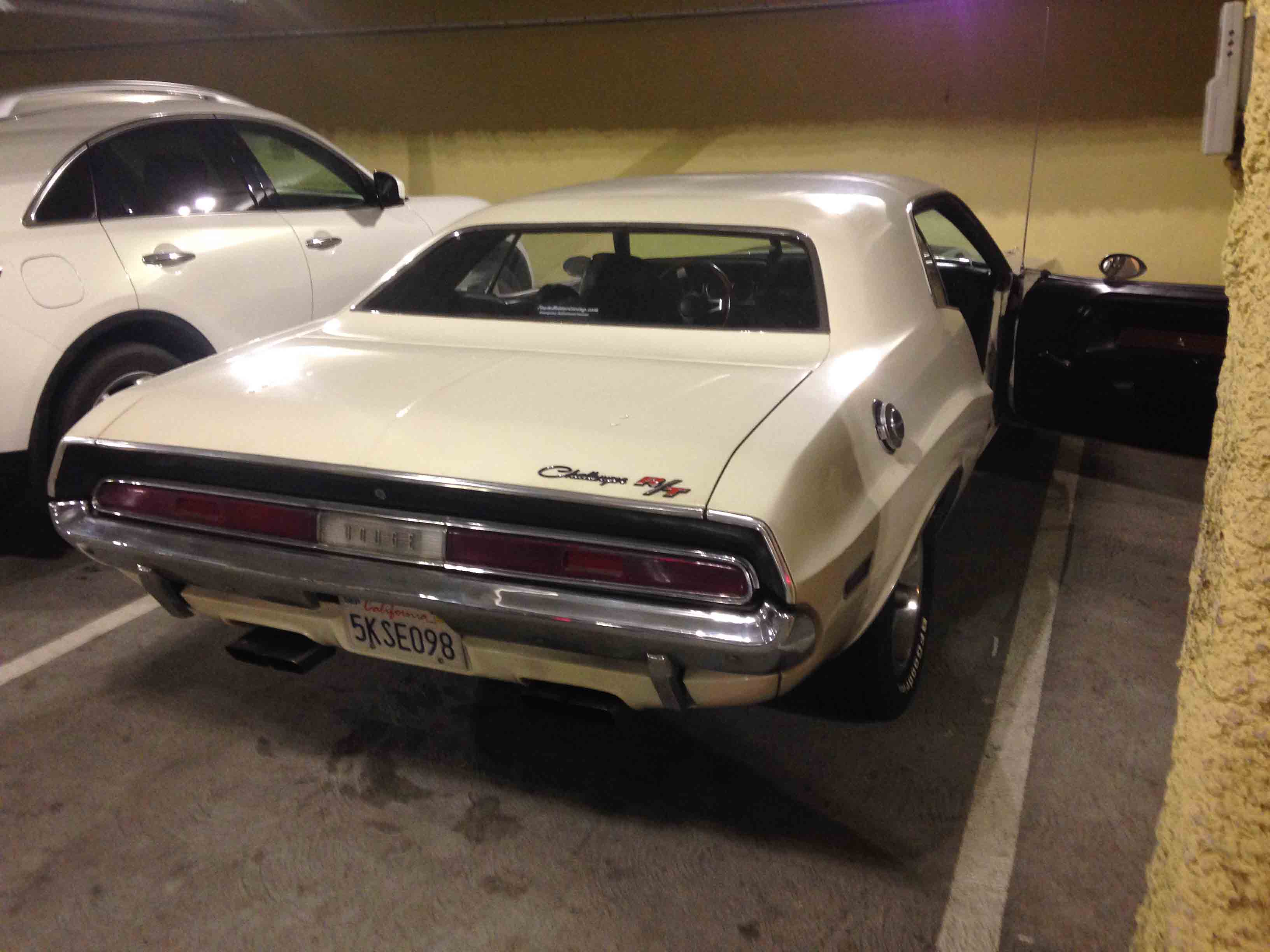 In the underground parking lot of a Whole Foods Market, doing some grocery getting with with th skids and  the 440 six pack Challenger. Right before I was pacing a blue Cobra roadster going down El Camino Real. THe traffic was too heavy for me to catch up with him but it would have been a pretty sight for onlookers to see a Cobra and a Challenger lined up at a stoplight on a Sunday afternoon in Silicon Valley. Nothing like stalking a Cobra to keep your mind focused on driving.